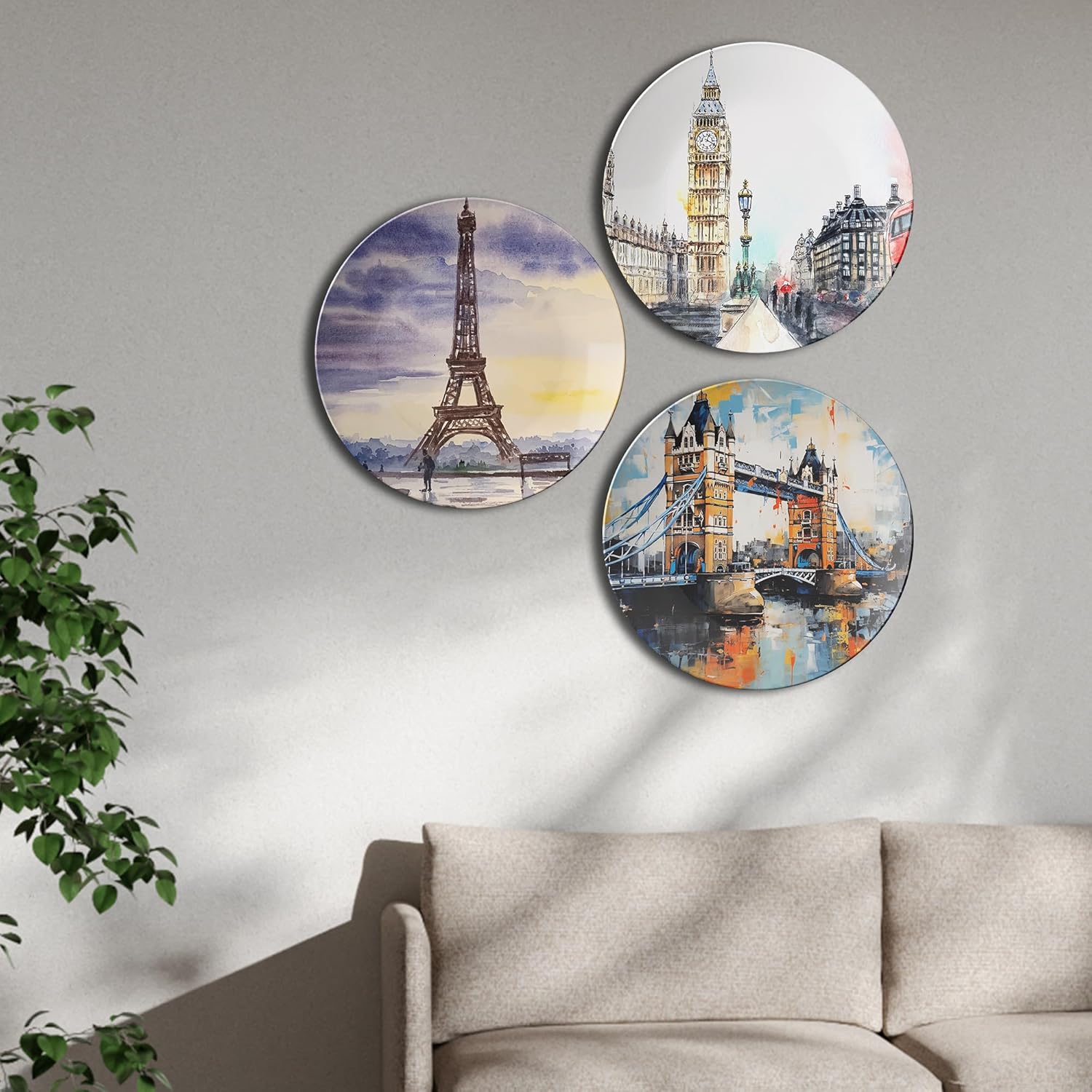 Wall Art with London and Paris Scenes Decorative Ceramic Wall Plates Set of 3.