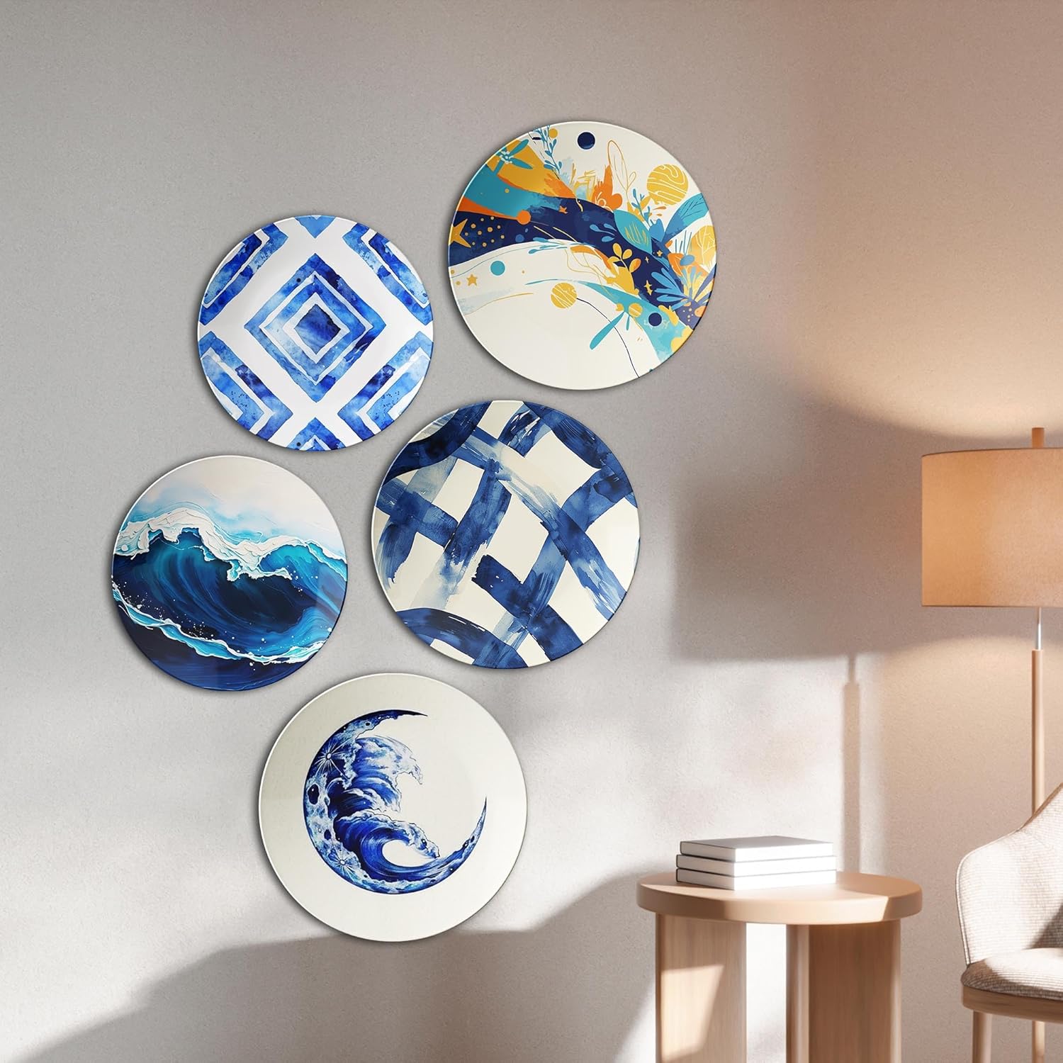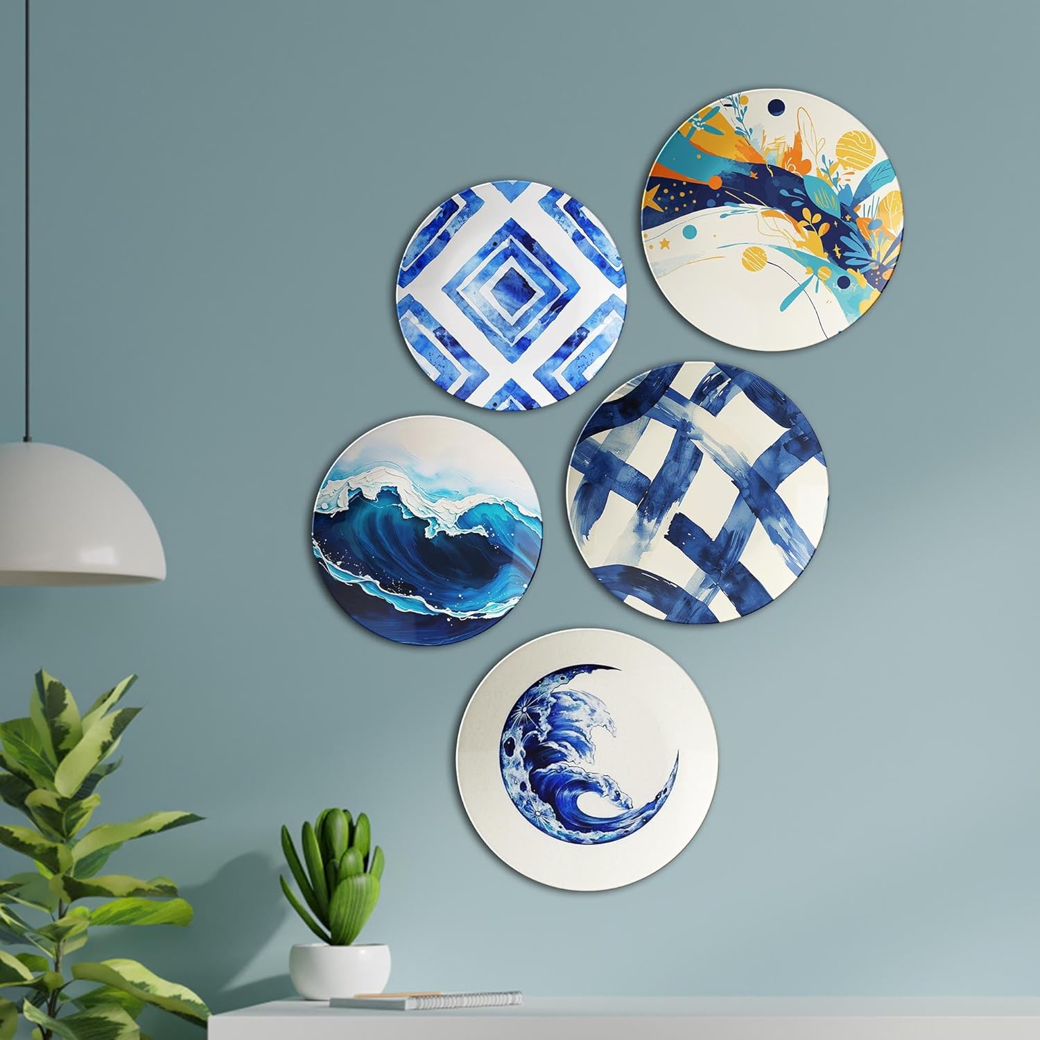 Waves and Geometric Blues | Home Decoration | Living Room Wall Decoration | Décor Items | Gift Items (Set of 5)